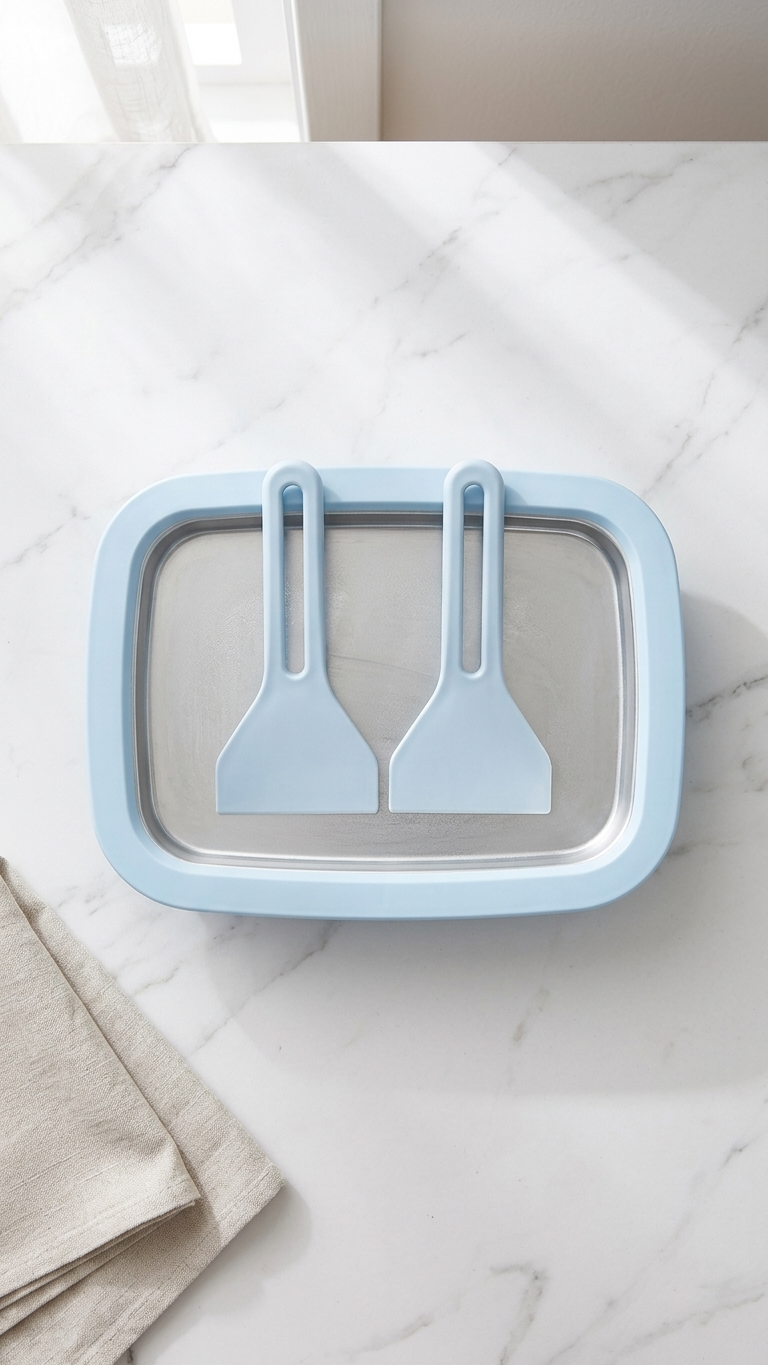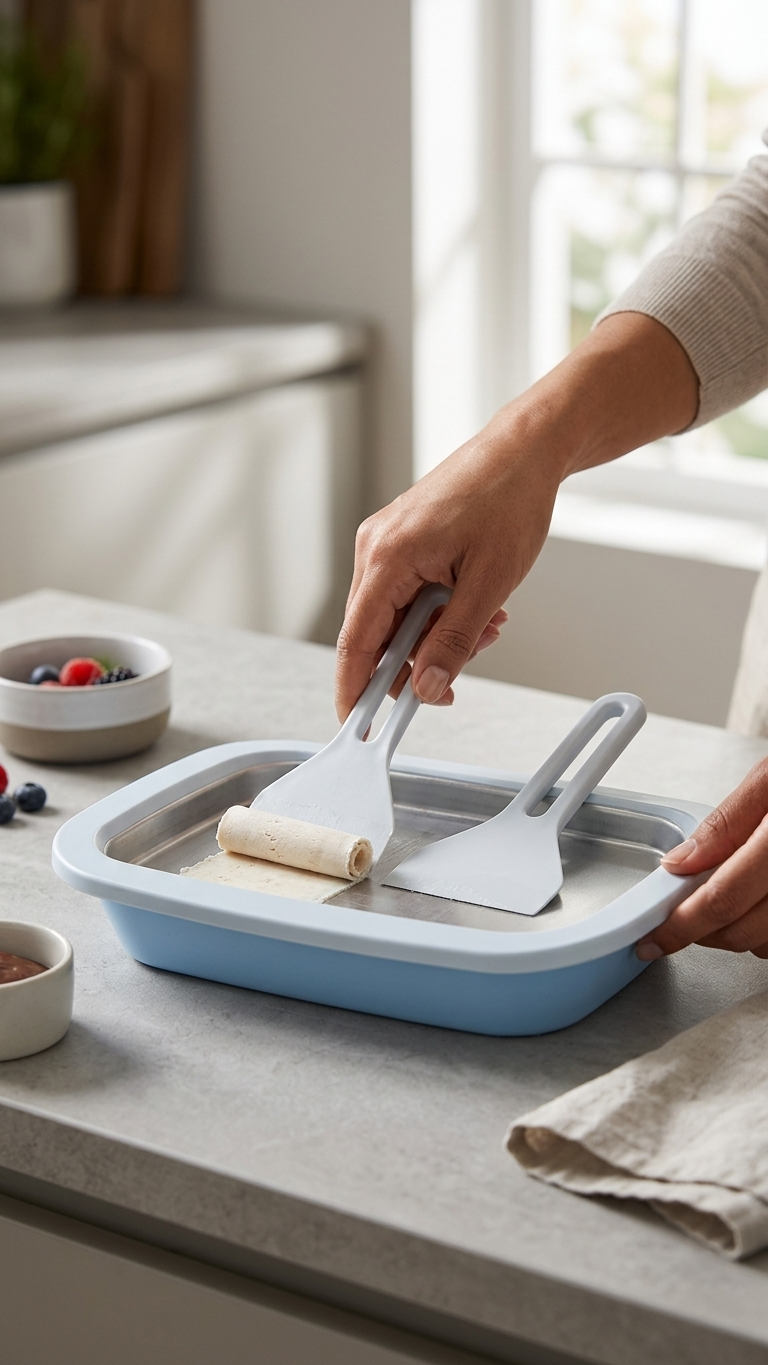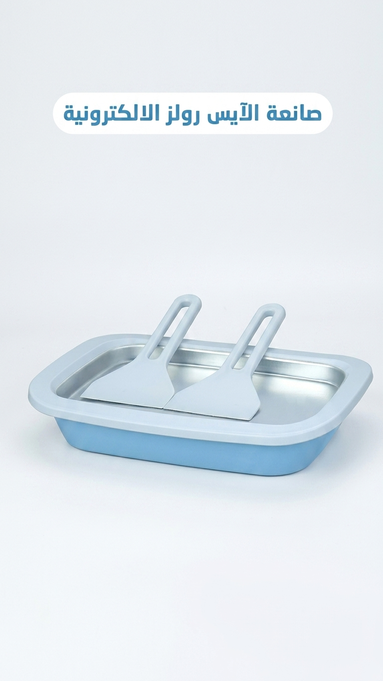 صينية منزلية مبتكرة لصنع لفائف الآيس كريم والجيلاتو والزبادي المثلج بسهولة ومرح، مناسبة جداً للأطفال ومحبي الحلويات المنزلية.